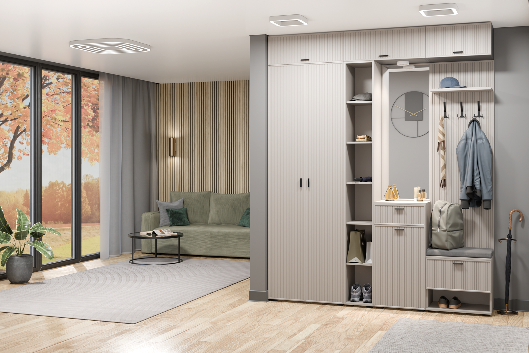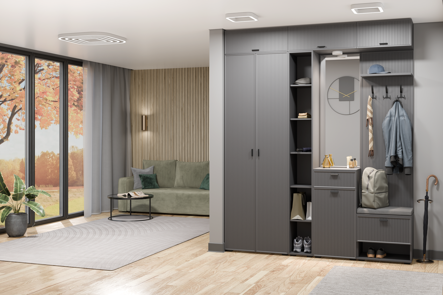 Применяемые материалы: корпус ЛДСП, фасад МДФ. Габаритные размеры: ВхШхГ — 2450х1980х352 мм. Прихожие СТЕЛЛА воплощают в себе актуальные тенденции мировой мебельной моды и позволяют создавать функциональные интерьеры в современном стиле, обеспечивающие высокий уровень комфорта. Сочетание нейтральных фоновых цветов и акцентных текстур дерева дают возможность открыть новые грани интерьера. Возможность использования различных вариантов вставки — дополнительное преимущество при планировании прихожей.